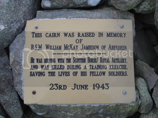 THIS CAIRN WAS RAISED IN MEMORY/OF/B.S.M. WILLIAM MCKAY JAMIESON OF ABERDEEN/-----/HE WAS SERVING WITH THE SCOTTISH HORSE/ROYAL ARTILLERY/AND WAS KILLED DURING A TRAINING EXERCISE,/SAVING THE LIVES OF HIS FELLOW SOLDIERS./23RD JUNE 1943