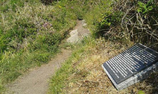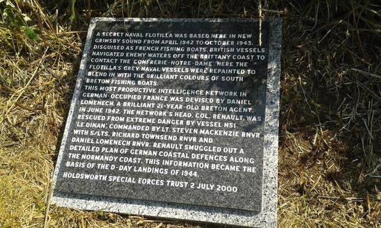 A SECRET NAVAL FLOTILLA WAS BASED HERE IN NEW GRIMSBY/ SOUND FROM APRIL 1942 TO OCTOBER 1943./ DISGUISED AS FRENCH FISHING BOATS, BRITISH VESSELS/ NAVIGATED ENEMY WATERS OFF THE BRITTANY COAST TO/ CONTACT THE 'CONFRERIE NOTRE-DAME'. HERE THE/ FLOTILLA'S GREY NAVAL VESSELS WERE REPAINTED TO/ BLEND IN WITH THE BRILLIANT COLOURS OF/ BRETON FISHING BOATS./ THIS MOST PRODUCTIVE INTELLIGENCE NETWORK IN/ GERMAN-OCCUPIED FRANCE WAS DEVISED BY DANIEL/ LOMENECH, A BRILLIANT 21-YEAR-OLD BRETON AGENT./ IN JUNE 1942, THE NETWORK'S HEAD, COL. RENAULT, WAS/ RESCUED FROM EXTREME DANGER BY VESSEL N51/ 'LE DINAN', COMMANDED BY LT. STEVEN MACKENZIE RNVR/ WITH S/LTS. RICHARD TOWNSEND RNVR AND/ DANIEL LOMENECH RNVR. RENAULT SMUGGLED OUT A/ DETAILED PLAN OF GERMAN COASTAL DEFENCES ALONG/ THE NORMANDY COAST. THIS INFORMATION BECAME THE/ BASIS OF THE D-DAY LANDINGS OF 1944./ HOLDSWORTH SPECIAL FORCES TRUST 2 JULY 2000
