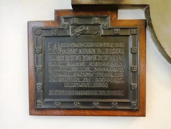IN LOVING MEMORY OF/ CAPTAIN CYRIL/ BURFIELD RIDLEY DSC/ RAF AGED 25 YEARS/ KILLED IN A COLLISION/ WHILST FLYING WITH HIS / SQUADRON/ AT COLOGNE/ 17 MAY 1920/ BLESSED ARE THE PURE IN HEART