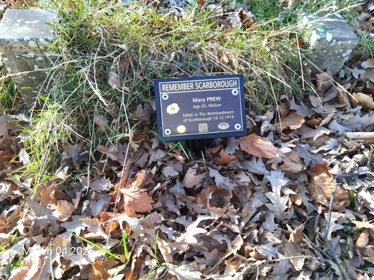 REMEMBER SCARBOROUGH/ MARY PREW/ AGE 65, WIDOW/ KILLED IN THE BOMMBARDMENT/ OF SCARBOROUGH 16.12.1914