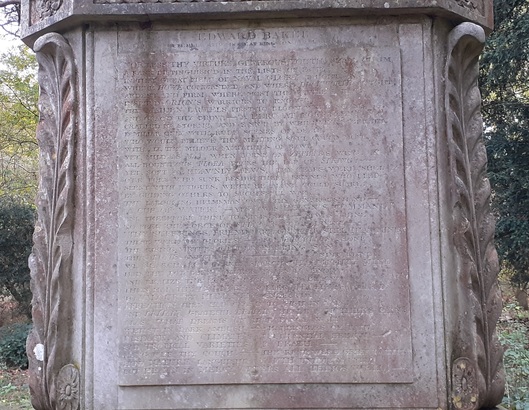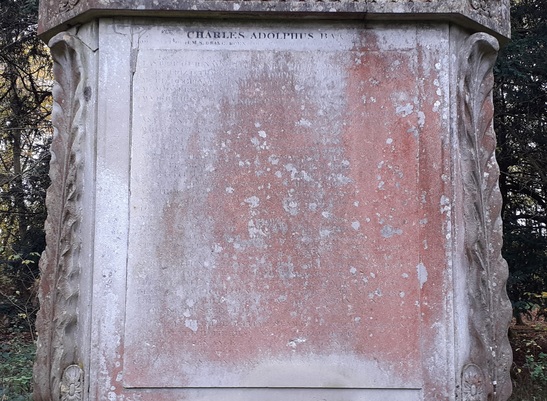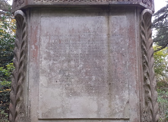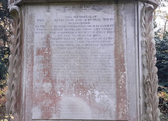 From WMR/28306: North face - THIS MEMORIAL OF / PRIVATE AFFECTION AND OF PUBLIC SENTIMENT / IS INSCRIBED / TO HENRY BAKER, COMMANDER OF H.M. SLOOP PELICAN, / WHO WITH JOHN DAVIS, HIS FIRST LIEUTENANT, AND / FOUR OTHER MARINERS, UNFORTUNATELY PERISHED / ON THE 9TH JUNE 1804, / OFF MORANT BAY IN THE ISLAND OF JAMAICA, / IN RESCUING FROM DESTRUCTION / THE ENTIRE CREW OF A SPANISH SCHOONER, / THEN FOUNDERING AT SEA. / Lower plinth west face - TO THE RECORD UPON THIS COLUMN OF BRAVE MEN FROM BAYFORDBURY, THIS ADDITION IS MADE IN 1915 BY HENRY CLINTON BAKER, IN MEMORY OF HIS BROTHER, OSBERT CLINTON BAKER. JOINED THE 1ST ROYAL IRISH RIFLES IN 1890. AFTER SERVICE IN THE BOER WAR, IN INDIA AND BURMAH, HE LAID DOWN HIS LIFE FOR HIS KING AND COUNTRY IN FLANDERS, ON MAY 9TH 1915 IN COMMAND OF HIS REGIMENT AS LIEUT. COLONEL, HE FELL AT FROMELLES, WHEN GALLANTLY LEADING HIS MEN, AND HELPING OTHERS LESS POWERFUL THAN HIMSELF TO CLIMB THE UNCUT BARBED WIRE. A GREAT DEATH FOR A GREAT CAUSE. BORN SEPTEMBER 25TH 186(?)9(?). DIED MAY 9TH 1915.