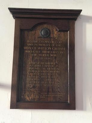 TO THE GLORY OF GOD/ AND IN MEMORY OF THE/ MEN OF WITTON GILBERT/ WHO GAVE THEIR LIVES IN/ THE WORLD WAR/ 1939 - 1945/ (9 names)/ THEY SHALL GROW NOT OLD AS WE THAT/ ARE LEFT GROW OLD./ AGE SHALL NOT WEARY THEM NOR THE YEARS CONDEMN/ AT THE GOING DOWN OF THE SUN AND IN THE MORNING/ WE WILL REMEMBER THEM
