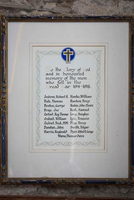 To the Glory of God/ and in honoured/memory of the men/who fell in the/Great War 1914‐1918/ (Names)