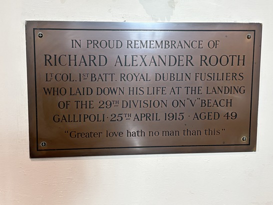 IN PROUD REMEMBRANCE OF/ RICHARD ALEXANDER ROOTH/ LT COL. 1ST BATT. ROYAL DUBLIN FUSILIERS/ WHO LAID DOWN HIS LIFE AT THE LANDING. OF THE 29TH DIVISON ON "V" BEACH/ GALLIPOLI. 25TH APRIL 1915. AGED 49/ "Greater love hath no man than this"