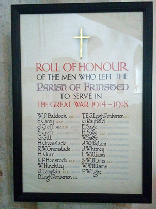 ROLL OF HONOUR OF THE MEN WHO LEFT THE PARISH OF FRINSTED TO SERVE IN THE GREAT WAR 1914 - 1918
