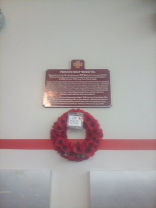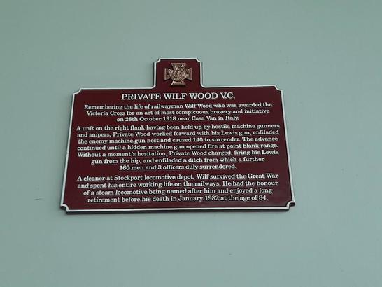 PRIVATE WILF WOOD V. C./ Remembering the life of railwayman Wilf Wood who was awarded the/ Victoria Cross for an act of most conspicuous bravery and initiative/ on 28th October 1918 near Casa Van in Italy./ A unit on the right flank having been held up by hostile machine gunners/ and snipers, Private Wood worked forward with his Lewis gun, enfiladed/ the enemy machine gun nest and caused 140 to surrender. The advance/ continued until a hidden machine gun opened fire at point blank range./ Without a moment's hesitation, Private Wood charged, firing his Lewis/ gun from the hip, and enfiladed a ditch from which a further 160 men and 3 officers duly surrendered./ A cleaner at Stockport locomotive depot, Wilf survived the Great War/ and spent his entire working life on the railways. He had the honour/ of a steam locomotive being named after him and enjoyed a long/ retirement before his death in January 1982 at the age of 84.