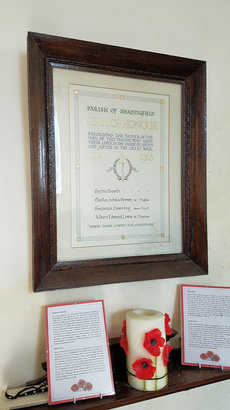 PARISH OF SHADINGFIELD / ROLL OF HONOUR / RECORDING THE NAMES OF THE / MEN OF THIS PARISH WHO GAVE / THEIR LIVES IN THE CAUSE OF LIBERTY / AND JUSTICE IN THE GREAT WAR, / 1914 1918 / (Names) / "THEIR NAME LIVETH FOR EVERMORE" //