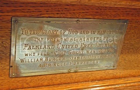 TO THE GLORY OF GOD AND IN MEMORY OF/THE FOLLOWING MEMBERS OF/FALKLAND UNITED FREE CHURCH/WHO GAVE THEIR LIVES IN THE GREAT WAR 1914-18/[names]