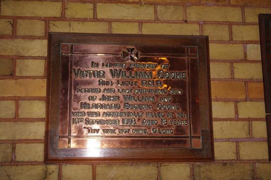 IN LOVING MEMORY OF/ VICTOR WILLIAM COOKE/ SUB-LIEUT. R.N.R./ SECOND AND LAST SURVIVING SON/ OF jOHN WILLIAM AND/ HILDEGARD EUGENIA COOKE,/ WHO WAS ACCIDENTALLY KILLED AT SEA/ 16TH SEPTEMBER 1903, AGED 18 YEARS/ "THY WAY, NOT MINE, O LORD."
