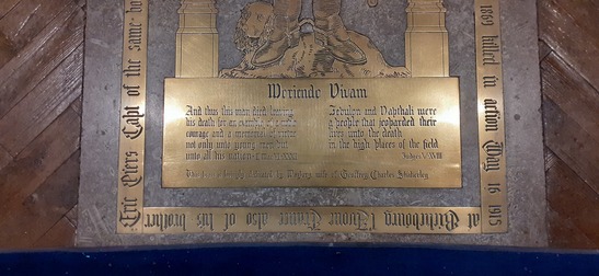 TO THE GLORY OF GOD AND IN LOVING MEMORY OF GEOFFREY CHARLES SHAKERLEY D.S.O. LT. COL. 1ST BATT ROYAL RIFLE CORPS BORN NOV 19 1869 KILLED IN ACTION MAY 15 1915 AT RICHEBOURG L'AVOUE FRANCE ALSO HIS BROTHER ERIC PIERS CAPT. OF THE SAME BORN MAR 8 1885 KILLED IN ACTION AT GIVENCHY FRANCE IN 1915 THE SOULS OF THE RIGHTEOUS ARE IN THE HAND OF GOD Moriendo Vivam And thus this man died, leaving his death for an example of a noble courage, and a memorial of virtue, not only unto young men, but unto all his nation II Mac. VI XXXI Zebulun and Naphtali were a people that jeoparded their lives unto the death in the high places of the field Judges V XVIII This brass is lovingly dedicated by Marjory wife of Geoffrey Charles Shakerley