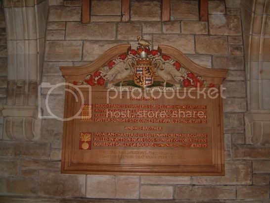 MCMXIV Remember MCMXVIII/ HUGO FRANCIS CHARTERIS LORD ELCHO CAPTAIN/ ROYAL GLOUCESTERSHIRE HUSSARS YEOMANRY/ KILLED IN ACTION AT KATIA DESERT OF SINAI ON/ EASTER SUNDAY ST. GEORGE'S DAY APRIL 23rd 1916 AETAT 32/ AND HIS BROTHER IVO ALAN CHARTERIS 2nd LIEUTENANT GRENADIER GUARDS/ KILLED IN ACTION NEAR LOOS SUNDAY OCTOBER 17 1915/ BURIED AT SAILLY LA BOURSE AETAT 19/ THE LORD SHALL PRESERVE THEE FROM ALL EVIL/ YEA IT IS EVEN HE THAT SHALL KEEP THY SOUL