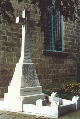6 o'clock face of cross: TO/ THE GLORY/ OF GOD/ AND IN/ GRATEFUL/ MEMORY OF/ THE MEN OF/ THIS PARISH WHO/ GAVE THEIR LIVES/ IN THE GREAT WAR/ 1914 - 1919 6 o'clock face of pedestal: (Names) 6 o'clock face of top step: "HEROES ALL, FOR US THEY DIED." 9 o'clock face of pedestal: (Names) 3 o'clock face of cross: ALSO/ IN/ LOVING/ MEMORY/ OF/ THE MEN/ OF HEAGE/ WHO DIED IN/ THE SECOND/ WORLD WAR/ 1939-1945 3 o'clock face of pedestal: (Names) 3 o'clock face of top step: "GREATER LOVE HATH NO MAN THAN THIS." Foot of kerbs: BAILEY/ ILKESTON Vase: ROYAL BRITISH/ LEGION/ 1921 - 1971./ GIVEN BY AMBERGATE/ HEAGE AND DISTRICT/ BRANCH