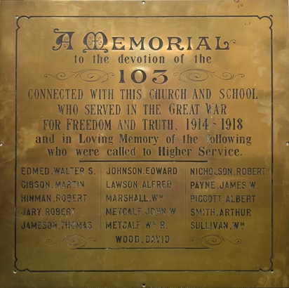 A Memorial to the devotion of 103 connected with this church and school who served in the Great War for freedom and truth, 1914-1918, and in loving memory of the following who were called to High Service. Edmed, Walter S. Johnson, Edward Nicholson, Robert Gibson, Martin Lawson, Alfred Payne, James W. Hinman, Robert Marshall, Wm. Piggott, Albert Jary, Robert Metcalf, John W. Smith, Arthur Jameson, Thomas Metcalf, Wm. R. Sullivan, Wm. Wood, David