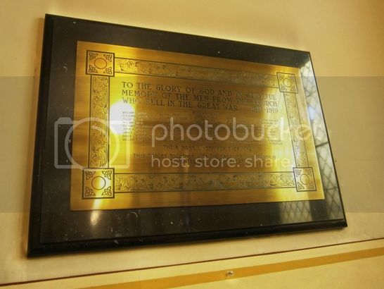 TO THE GLORY OF GOD AND IN GRATEFUL/MEMORY OF THE MEN FROM THIS CHURCH/WHO FELL IN THE GREAT WAR 1914-1919/[names in 5 columns]/THEIR NAME LIVETH FOR EVERMORE/THIS TABLET TOGETHER WITH THE ORGAN OF THIS CHURCH IS/DEDICATED BY THE CONGREGATION
