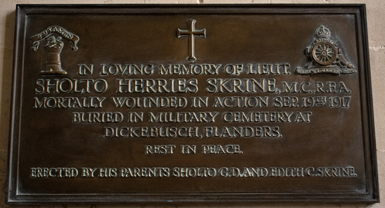 IN LOVING MEMORY OF LIEUT/SHOLTO HERRIES SKRINE MC RFA/ MORTALLY WOUNDED IN ACTION SEP 19TH 1917/ BURIED IN MILITARY CEMETERY AT/ DICKEBUSCH FLANDERS/ REST IN PEACE/ ERECTED BY HIS PARENTS SHOLTO G D AND EDITH S SKRINE