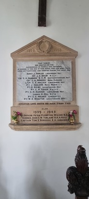 Tympanum : 1914 1918 / Tablet : THIS TABLET / WAS ERECTED BY THE / PARISHIONERS OF TINWELL AND INGTHORPE, / IN MEMORY OF THE MEN OF THIS PARISH, WHO LAID DOWN THEIR / LIVES FOR THEIR KING AND COUNTRY DURING THE GREAT WAR / [12 names] / Frame : GREATER LOVE HATH NO MAN THAN THIS / Block : ALSO / 1939 - 1945 / [3 names]