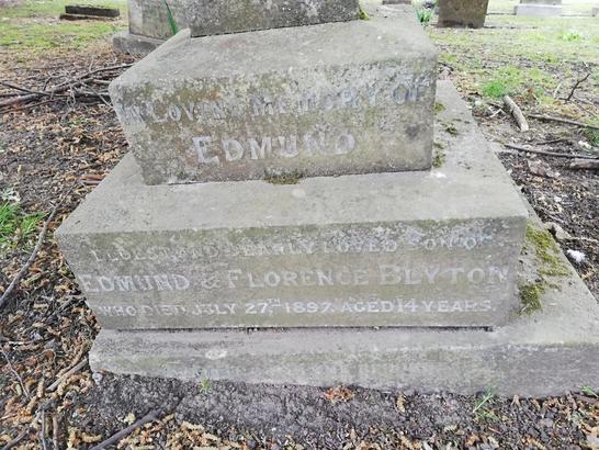 Front face In Loving Memory of / Edmund / Eldest and Dearly Loved Son of / Edmund & Florence Blyton / who died July 27th 1897, aged 14 years / [Remainder unreadable] Rear Face In Loving Memory of / Lieut Arthur Allister Blyton / 70th Brigade, 15th Division / Born 14th September 1891 / Killed in action at Pont-A-Trois, ?ueule? / France / 5th September 1918 & Buried in (unreadable) Cemetery / At Vis-en-Artois, France, Aged 28 Years / Youngest Son of Edmund & Florence Blyton / Greater Love Hath No Man Than This, That A Man Lay Down His Life For His Friends