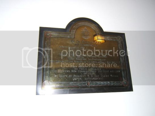 TO THE GLORY OF GOD/AND IN MEMORY OF /[names]/WHO DIED ON ACTIVE SERVICE IN THE SOUTH AFRICAN WAR 1899 - 1902/THIS BRASS IS DEDICATED /BY THEIR COMRADES /THE OFFICERS, NON-COMMISSIONED OFFICERS AND MEN /OF THE /1ST (CITY OF DUNDEE) V.B. THE BLACK WATCH/ (ROYAL HIGHLANDERS)