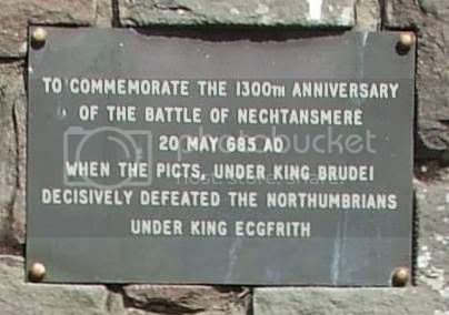TO COMMEMORATE THE 1300TH ANNIVERSARY /OF THE BATTLE OF NECHTANSMERE/20 MAY 685 AD/WHEN THE PICTS, UNER KING BRUDEI/DECISIVELY DEFEATED THE NORTHUMBRIANS/UNDER KING EGGFRITH