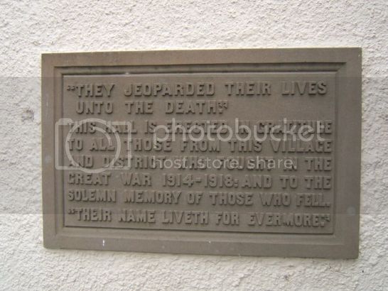 Tablet- "THEY JEOPARDED THEIR LIVES / UNTO THE DEATH." / THIS HALL IS ERECTED IN GRATITUDE / TO ALL THOSE FROM THIS VILLAGE / AND DISTRICT WHO FOUGHT IN THE / GREAT WAR 1914-1918: AND TO THE / SOLEMN MEMORY OF THOSE WHO FELL. / "THEIR NAME LIVETH FOR EVERMORE."