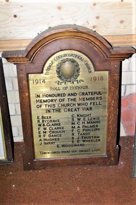 TYNDALE CONGREGATIONAL CHURCH/ 1914 - 1918/ ROLL OF HONOUR/ IN HONOURED AND GRATEFUL/ MEMORY OF THE MEMBERS/ OF THIS CHURCH WHO FELL/ IN THE GREAT WAR/ (Names)/ "THEY DIED THAT WE MIGHT LIVE"