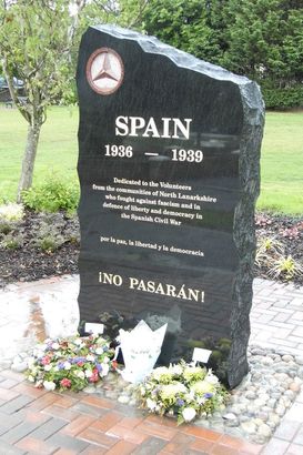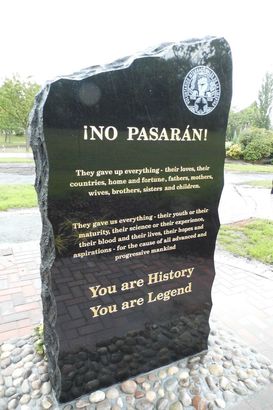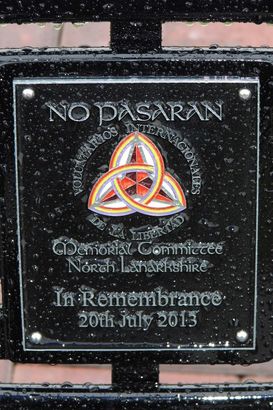 Stone - Front Face: SPAIN/1936-1939/Dedicated to the Volunteers/from the communities of North Lanarkshire/who fought against fascism and in/defence of liberty and democracy in/the Spanish Civil War//pour la par, la libertad y la democracia//! NO PASARANI! Rear Face: ! NO PASARANI!//They gave up everything- their loves, their/countries, home and fortune. fathers. mothers,/wives, brothers, sisters and children.//They gave us everything- their youth or their/maturity, their science or their experience,/their blood and their lives, their hopes and/aspirations- for the cause of all advanced and/progressive mankind//You are History/You are Legend. Bench - NO PASARAN/VOLUNTARIOS INTERNACIONALES/DE LA LIBERTAD/Memorial Committee/North Lanarkshire/In Remembrance/20th July 2013