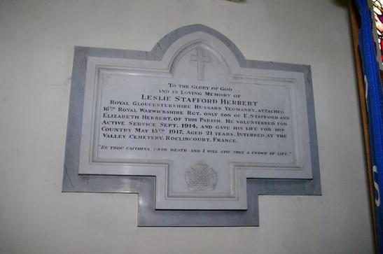 TO THE GLORY OF GOD/ AND IN LOVING MEMORY OF/ LESLIE STAFFORD HERBERT/ ROYAL GLOUCESTERSHIRE HUSSARS YEOMANRY ATTACHED,/ 16TH ROYAL WARWICKSHIRE RGT. ONLY SON OF E. STAFFORD AND/ ELIZABETH HERBERT OF THIS PARISH. HE VOLUNTEERED FOR/ ACTIVE SERVICE SEPT. 1914, AND GAVE HIS LIFE FOR HIS/ COUNTRY MAY 15TH. 1917, AGED 21 YEARS. INTERRED AT THE/ VALLEY CEMETERY, ROCLINCOURT, FRANCE./ "BE THOU FAITHFUL UNTO DEATH AND I WILL GIVE THEE A CROWN OF THORNS"