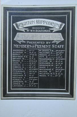 BRIGHTON HIPPODROME/ MANAGER/ MR W.H. BOARDMAN/ ROLL OF HONOUR/ PRESENTED BY/ MEMBERS OF PRESENT STAFF/ (NAMES)