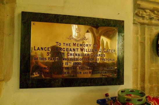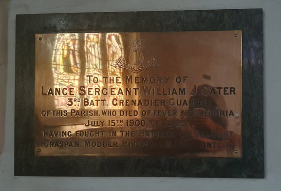 TO THE MEMORY OF/ LANCE SERGEANT WILLIAM J. CATER/ 3RD BATT. GRENADIER GUARDS/ OF THIS PARISH, WHO DIED OF FEVER AT PRETORIA/ JULY 15TH 1900, AGED 25/ HAVING FOUGHT IN THE BATTLES OF BELMONT,/ GRASPAN, MODDER RIVER AND MAGERSFONTEIN.