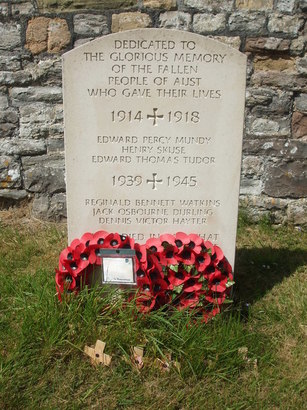 DEDICATED TO/ THE GLORIOUS MEMORY/ OF THE FALLEN/ PEOPLE OF AUST/ WHO GAVE THEIR LIVES/ 1914 - 1918/ (Names)/ 1939 - 1945/ (Names)/ (...)