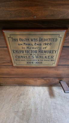 This organ was dedicated/on April 2nd 1920/in Memory of/Ralph Victor Armorey/and/Charles Walker/who lost their lives in The Great War/1914-1918