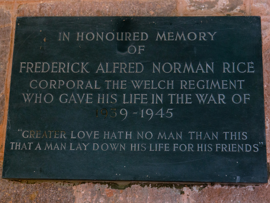 IN HONOURED MEMORY/ OF/ FREDERICK ALFRED NORMEN RICE/ CORPORAL THE WELCH REGIMENT/ WHO GAVE HIS LIFE IN THE WAR OF/ 1939 - 1945/ "GREATER LOVE HATH NO MAN THAN THIS/ THAT A MAN LAY DOWN HIS LIFE FOR HIS FRIENDS"
