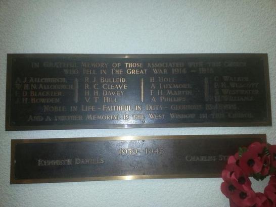 IN GRATEFUL MEMORY OF THOSE ASSOCIATED WITH THIS CHURCH/ WHO FELL IN THE GREAT WAR 1914 - 1918/ (Names)/ NOBLE IN LIFE - FAITHFUL IN DUTY - GLORIOUS IN DEATH/ AND A FURTHER MEMORIAL IS THE WEST WINDOW IN THE CHURCH/ 1939 - 1945/ (Names)