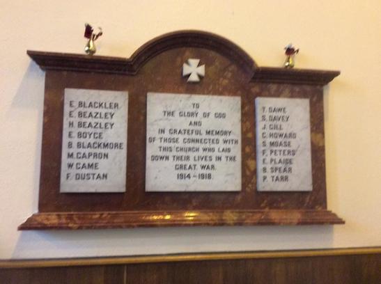 TO/ THE GLORY OF GOD/ AND/ IN GRATEFUL MEMORY/ OF THOSE CONNECTED WITH/ THIS CHURCH WHO LAID/ DOWN THEIR LIVES IN THE/ GREAT WAR./ 1914 - 1918./ (Names)
