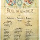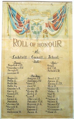For his country's sake/Roll of Honour, of/Cockfield Council School/Staff/ [Column 1]- Present/[4 names of whom 1 fell] [Column 2]- Past /[3 names of whom none fell]/ Old Boys/[42 names in 3 columns of whom 8 fell]