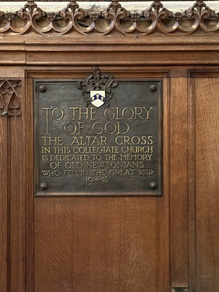 TO THE GLORY/ OF GOD/ THE ALTAR CROSS/ IN THIS COLLEGIATE CHURCH/ IS DEDICATED TO THE MEMORY/ OF OLD NEWTONIANS/ WHO FELL IN THE GREAT WAR/ 1914-18