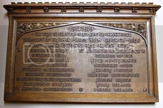 1914-1919/TO THE GLORY OF GOD AND IN GRATEFUL/MEMORY OF THOSE FROM THIS CHURCH WHO/GAVE THEIR LIVES IN THE GREAT WAR/[18 names in 2 columns]
