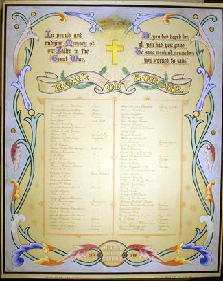 In proud and/ undying Memory of/ our Fallen in the/ Great War./ "All you had hoped for,/ all you had you gave./ To save mankind yourselves/ you scorned to save"./ (Names)/ 1914/ Acomb/ and/ Knapton/ 1918