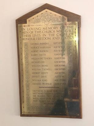 NEC - TAMEN - CONSUMEBATUR/ IN LOVING MEMORY OF THE/ MEN OF THIS CHURCH WHO GAVE/ THEIR LIVES IN THE CAUSE OF/ HONOUR FREEDOM AND JUSTICE/ (Names)/ "NOTHING IS HERE FOR TEARS/ NOTHING TO WAIL, DISPRAISE/ OR BLAME. NOTHING BUT/ WELL AND FAIR AND WHAT/ MAY QUIET US IN A DEATH/ SO NOBLE