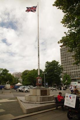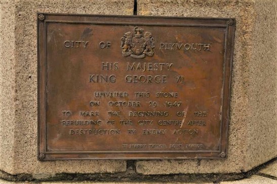 CITY OF PLYMOUTH/ HIS MAJESTY/ KING GEORGE VI/ UNVEILED THIS STONE/ ON OCTOBER 29 1947/ TO MARK THE BEGINNING OF THE/ REBUILDING OF THE CITY CENTRE AFTER/ DESTRUCTION BY ENEMY ACTION/ W HARRY TAYLOR LORD MAYOR