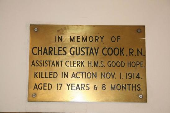 IN MEMORY OF/ CHARLES GUSTAV COOK, R.N./ ASSISSTANT CLERK H.M.S. GOOD HOPE./ KILLED IN ACTION NOV.1.1914/ AGED 17 YEARS & 8 MONTHS