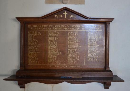 1914 - 1918/ TO THE GLORY OF GOD AND IN HONOURED MEMORY OF/ THE MEN OF THIS PARISH WHO FELL IN THE GREAT WAR./ (Names)/ THEY DIED THAT WE MIGHT LIVE