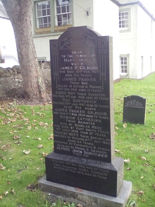SACRED/TO THE MEMORY OF/MARY BRUCE/WIFE OF/JAMES P. GILMOUR/WHO DIED 10TH FEB. 1929/AGED 64 YEARS/JAMES PARKER/THEIR SON/KILLED IN ACTION IN FRANCE/14TH SEP. 1914 AGED 21 YEARS/..../THOMAS WATT THEIR SON-IN-LAW/WHO DIED OF WOUNDS 27TH JULY 1943/AGED 34 YEARS/INTERRED AT ENFIDAVILLE N. AFRICA/HUSBAND OF MONA C. GILMOUR/...