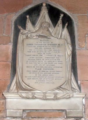 SACRED TO THE MEMORY OF JAMES FREDERICK STEUART MD ASSISTANT SURGEON IN HM INDIAN ARMY AND LATE SURGEON TO THE BHURTPORE POLITICAL AGENCY WHO DIED AT AGRA ON THE 21 JULY 1861 AGED 28 YEARS ELDEST SON OF ROBERT STEUART OF CARFIN AFTER SERVING THROUGHOUT THE CRIMEAN CAMPAIGN WITH H.M. 28 REG HE ENTERED THE INDIAN ARMY WITH WHICH HE WAS PRESENT AT THE RELIEF AND FINAL CAPTURE OF LUCKNOW WHERE HE WAS SUBSEQUENTLY APPOINTED FIELD SURGEON THIS TABLET IS ERECTED TO HIS MEMORY BY SOME OF HIS BROTHER OFFICERS OF THE BENGAL ARMY TO MARK THEIR FEELINGS OF RESPECT, ESTEEM AND DEEP REGARD FOR AN EFFICIENT OFFICER A SINCERE FRIEND AND A TRUE CHRISTIAN