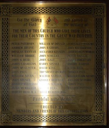 Column 1- Peter Paterson/ Andrew Irvine/ Douglas Hannah/ William Brodie/ John G. Reid/ James S. Hamilton/ John McAlister/ John Paul/ William Niven/ John Spence/ Alistair MacMillan Grant/ Peter McWilliam/ Robert Reid MA; Column 2- William McDonald/ John R. Gibson/ Alexander Kennedy/ John Scollan/ John Galt/ Harry Spence/ David King/ Thomas Stevenson Watt/ Walter Napier/ George C. Botfield/ Norman Peacock/ Robert Dean/ Robert Buchanan Craig; Column 3- James Glen Craig MC/ John Matthewson/ Arthur Logan Murray/ Peter Baillie/ James Robertson/ Robert Harper/ David Reid/ Thomas Pate/ William Clark Wilson/ William McIndoe/ Edwin Paul/ William Pattison