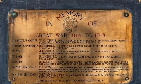 IN MEMORY OF/ GREAT WAR 1914 TO 1918./ (7 names)/ "GREATER LOVE HATH NO MAN THAN THIS."