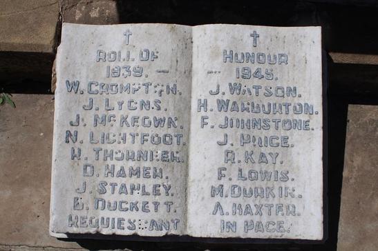 WW1 - Plinth: IN HOLY REMEMBRANCE OF/ MEN OF THIS PARISH WHO NOBLY LAID DOWN THEIR LIVES/ IN THE GREAT WAR 1914 - 1918/ (Names)/ "IT IS BETTER FOR US TO DIE IN BATTLE/ THAN TO SEE THE EVILS OF OUR NATION" 1 MACHABEES III 59. WW2 - Left Hand 'Page'- +/ROLL OF/1939/[names] Right Hand 'Page'-+/HONOUR/1945
