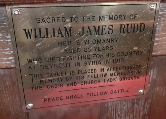 SACRED TO THE MEMORY OF / WILLIAM JAMES RUDD / HERTS YEOMANRY / AGED 25 YEARS / WHO DIED FIGHTING FOR HIS COUNTRY / AT BEYROUT IN SYRIA IN 1918 / THIS TABLET IS PLACED IN AFFECTIONATE / MEMORY BY HIS FELLOW MEMBERS IN / THE CHOIR AND CHURCH LADS' BRIGADE / "PEACE SHALL FOLLOW BATTLE"