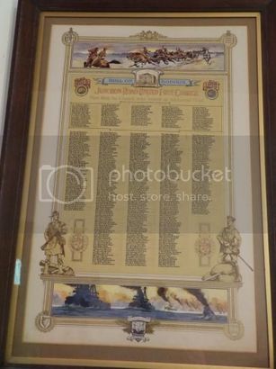 ROLL OF HONOUR/JUNCTION ROAD UNITED FREE CHURCH/[unreadable]/[names of the fallen in 5 columns]/[names of the served in 5 columns]