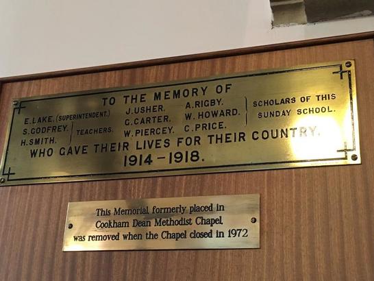 The original plaque- TO THE MEMORY OF / (names) / WHO GAVE THEIR LIVES FOR THEIR COUNTRY, / 1914 -1918/SCHIOLARS OF THIS/SUNDAY SCHOOL; The relocation plaque-This Memorial formerly placed in/Cookham Dean Methodist Chapel/was removed when the Chapel closed in 1972.
